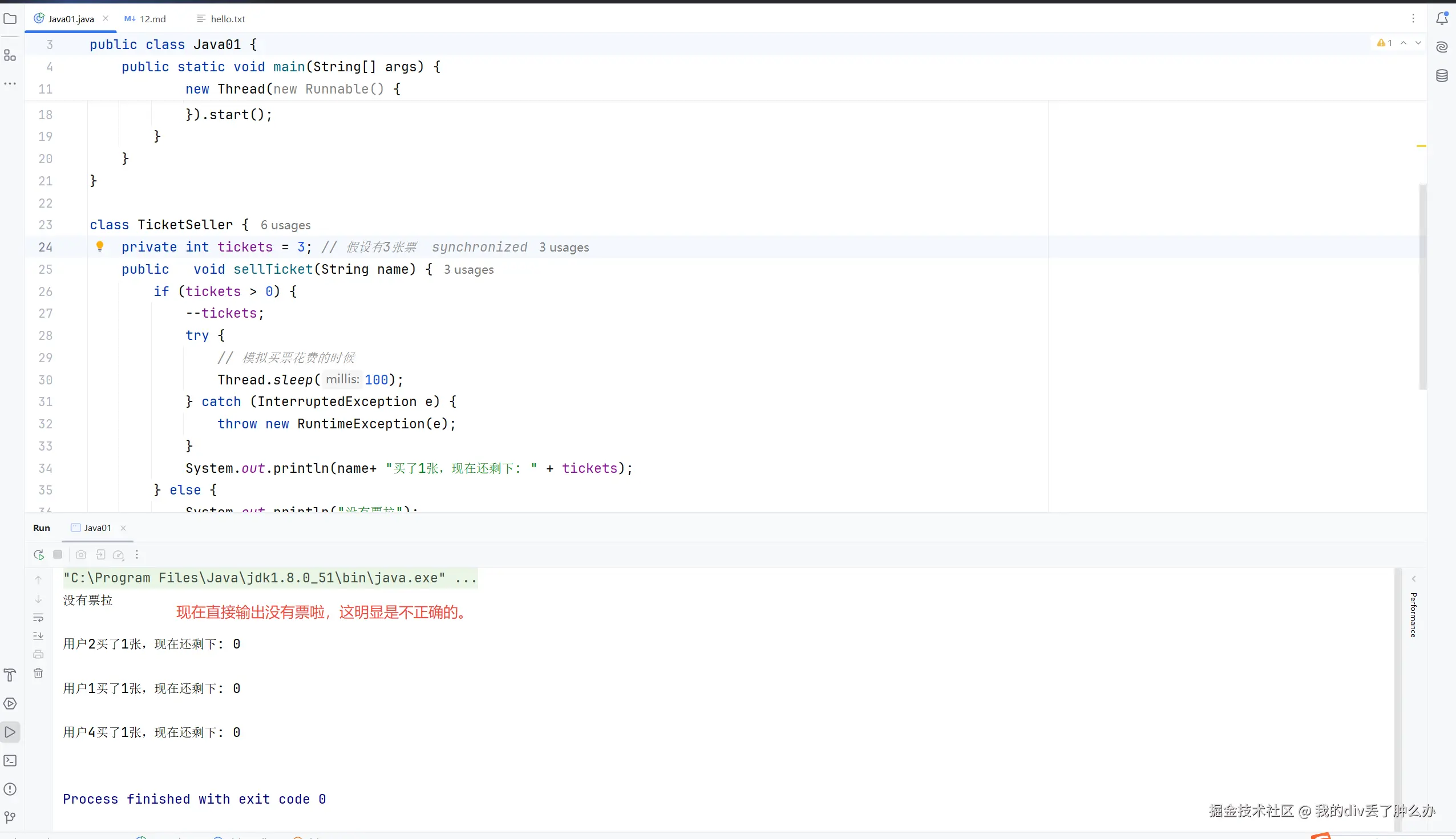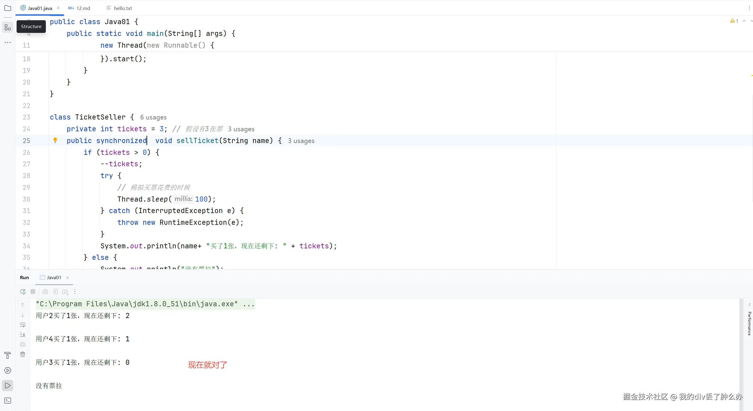 private int tickets = 3; // 假设有3张票 synchronized