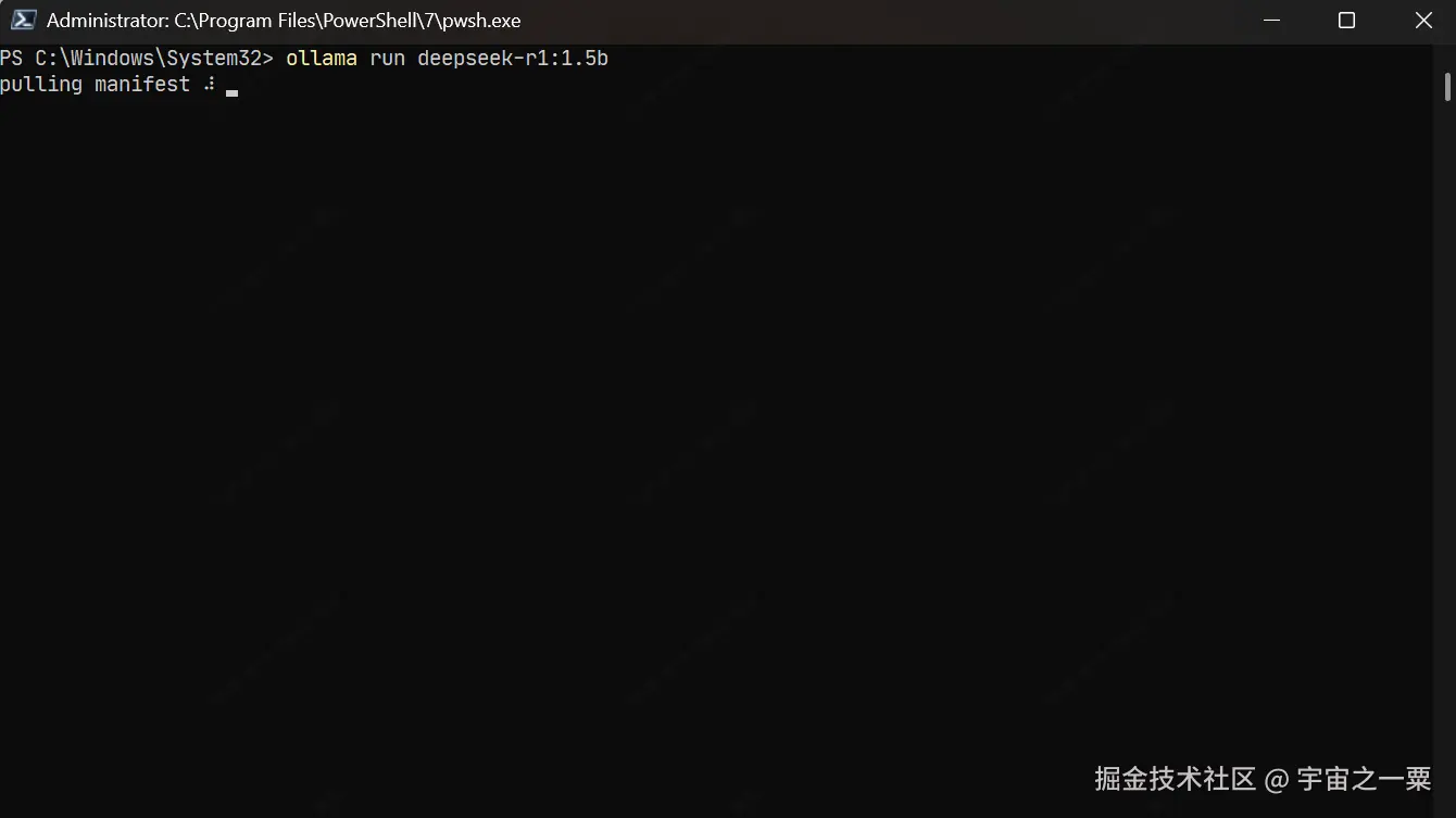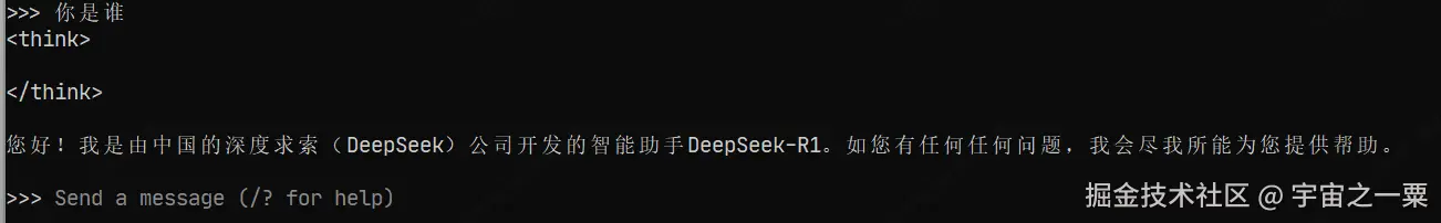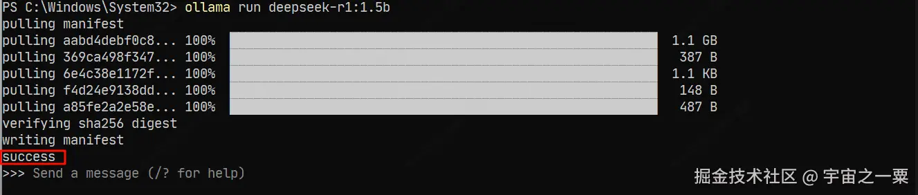 我的电脑显卡不太高,直接在命令行输入:ollama run deepseek-r1:1.5b