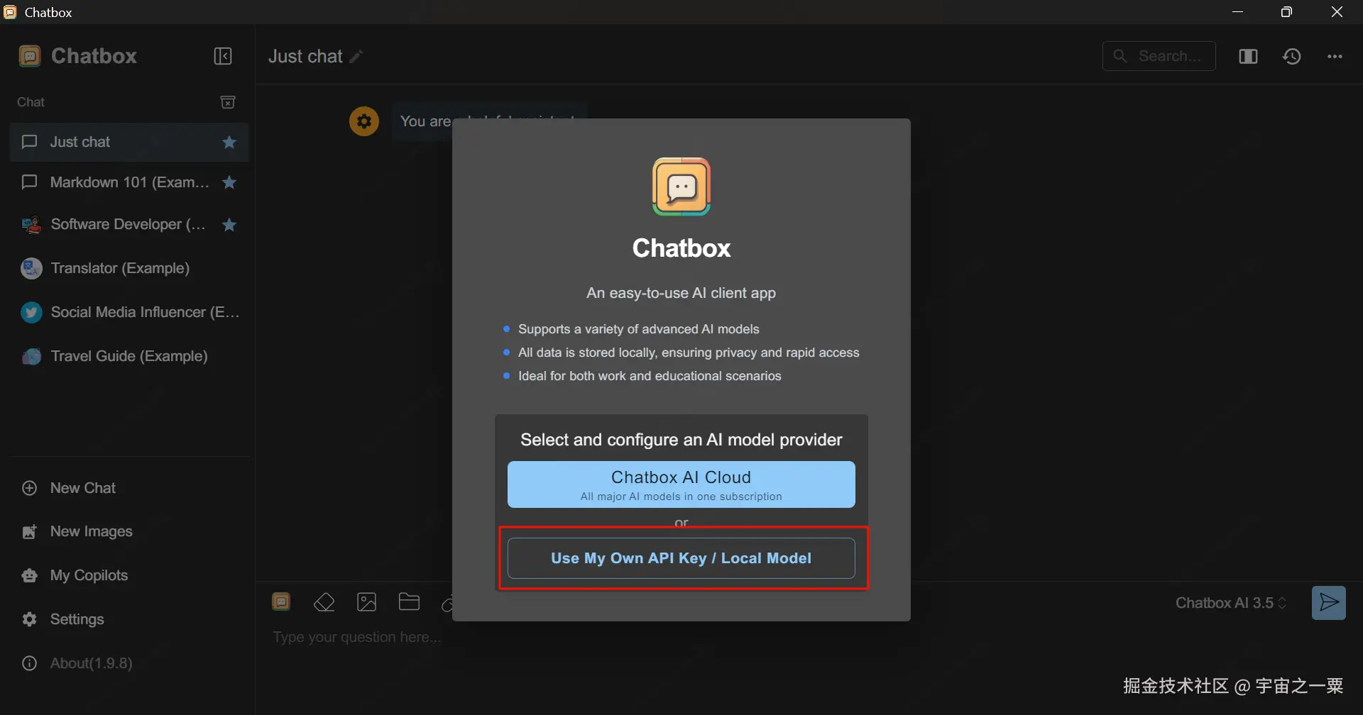 下载完 Windows 安装包,并打开之后,点击 Use My Own API Key/Local Model,如图: