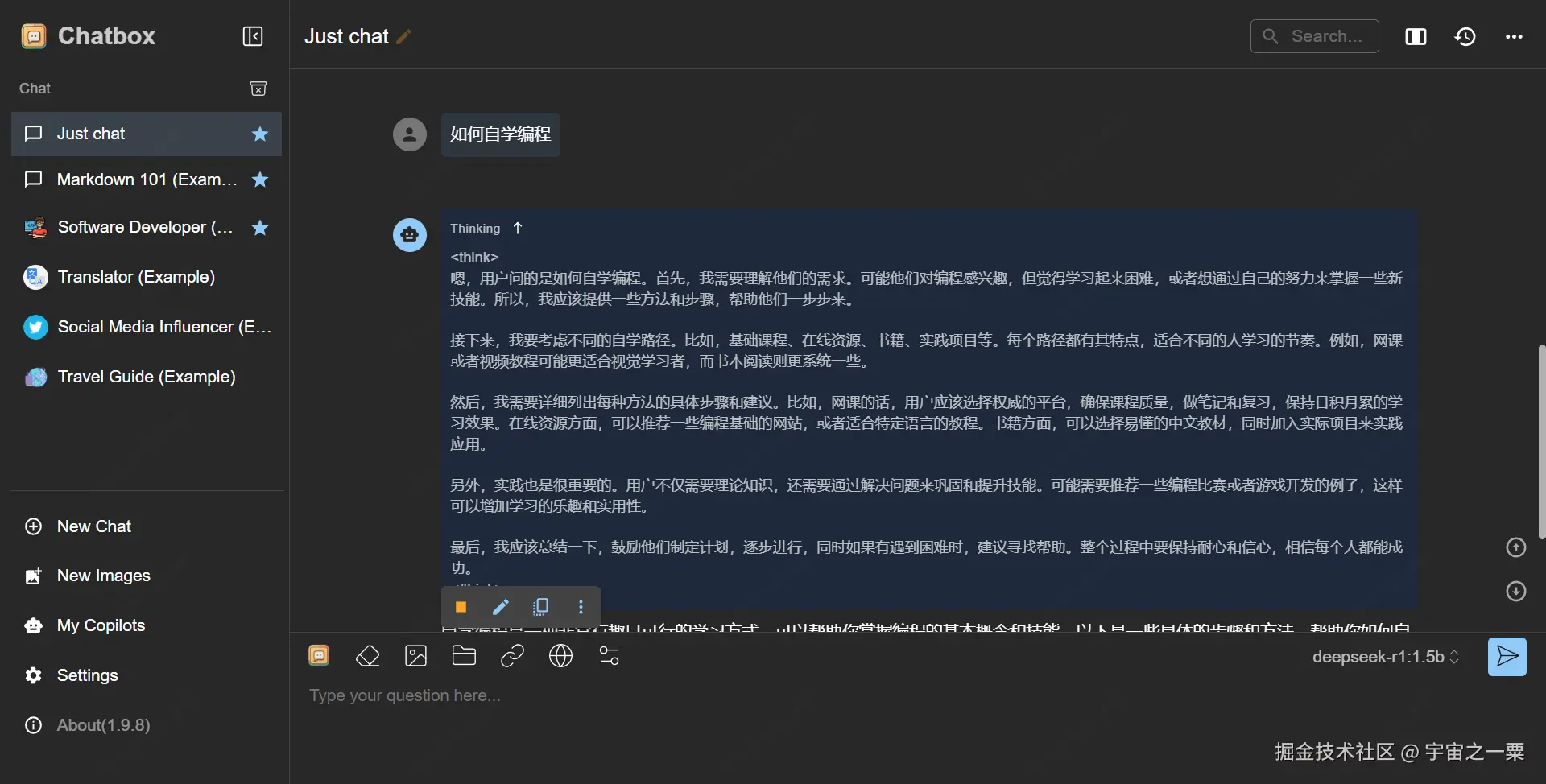 在 Chatbox 界面下,测试 deepseek-r1 模型