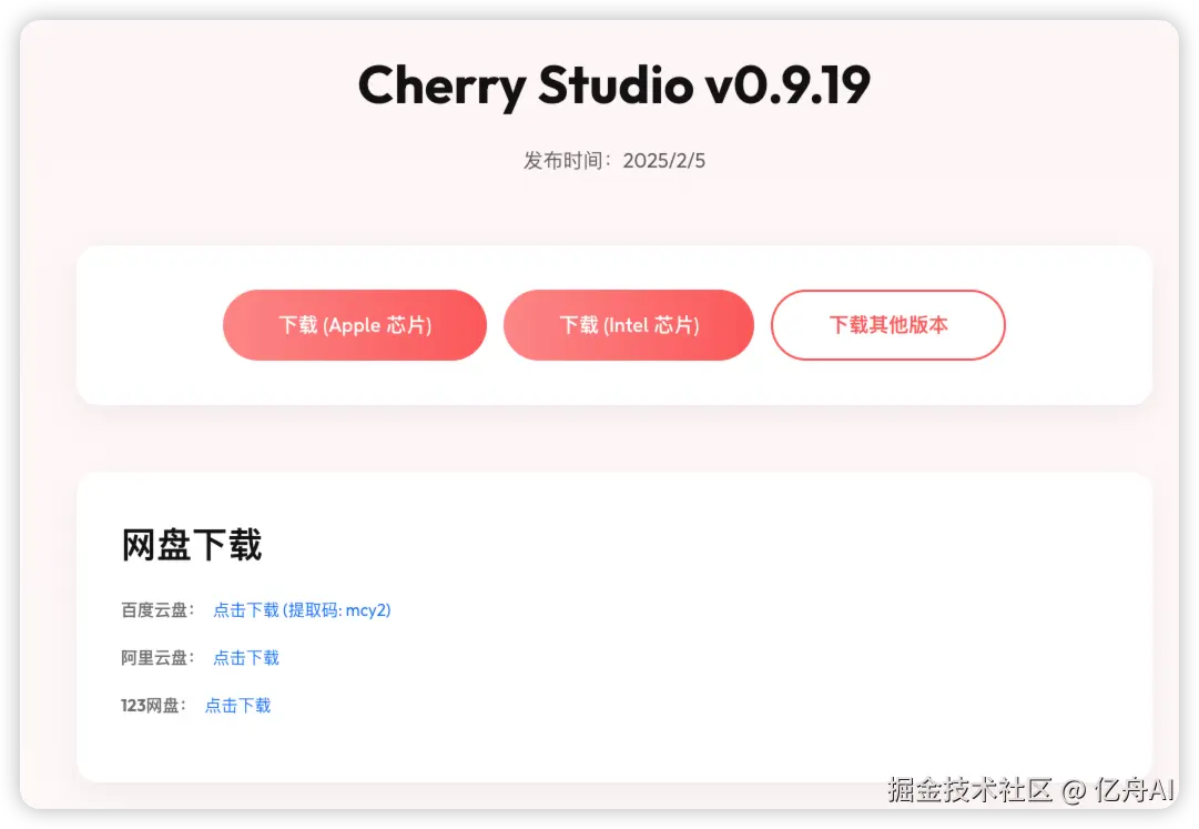进入到 Cherry Studio 的下载页面,这是一个支持 AI 大模型 API 的桌面应用。选择对应的操作系统进行下载。
