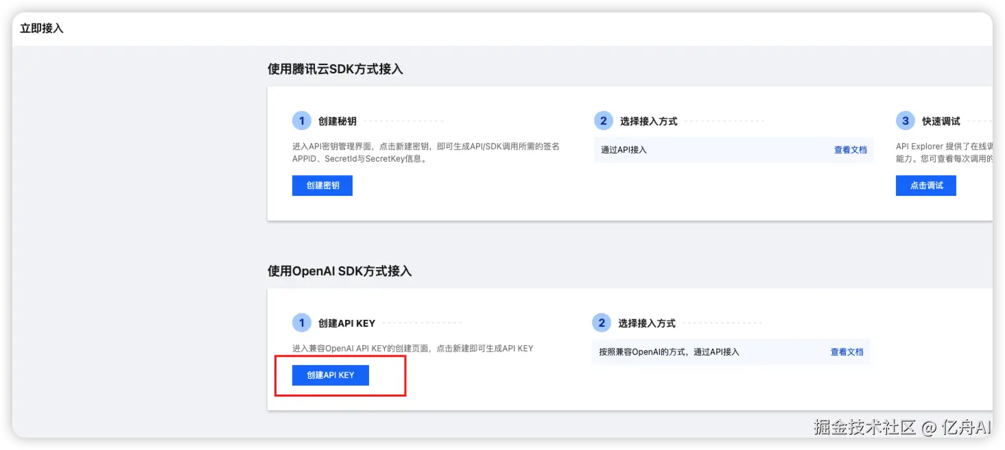 进入页面后选择“知识引擎原子能力”,在立即接入界面,选择“使用 OpenAI SDK 方式接入”下方的“创建 API KEY”