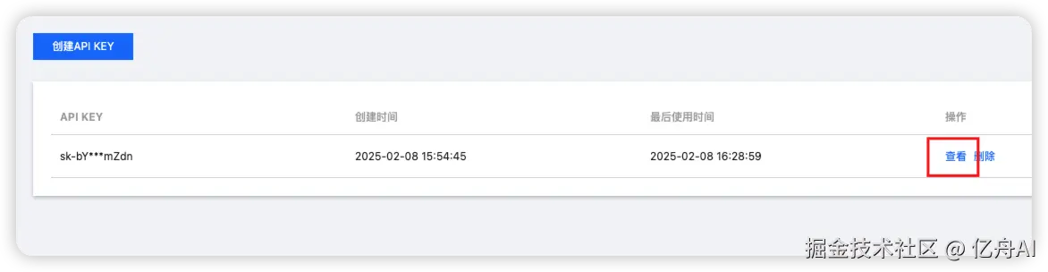 点击“创建 API KEY”,然后点查看,把 sk 开头的 key 复制下来,注意 key 不要发给其他人哦