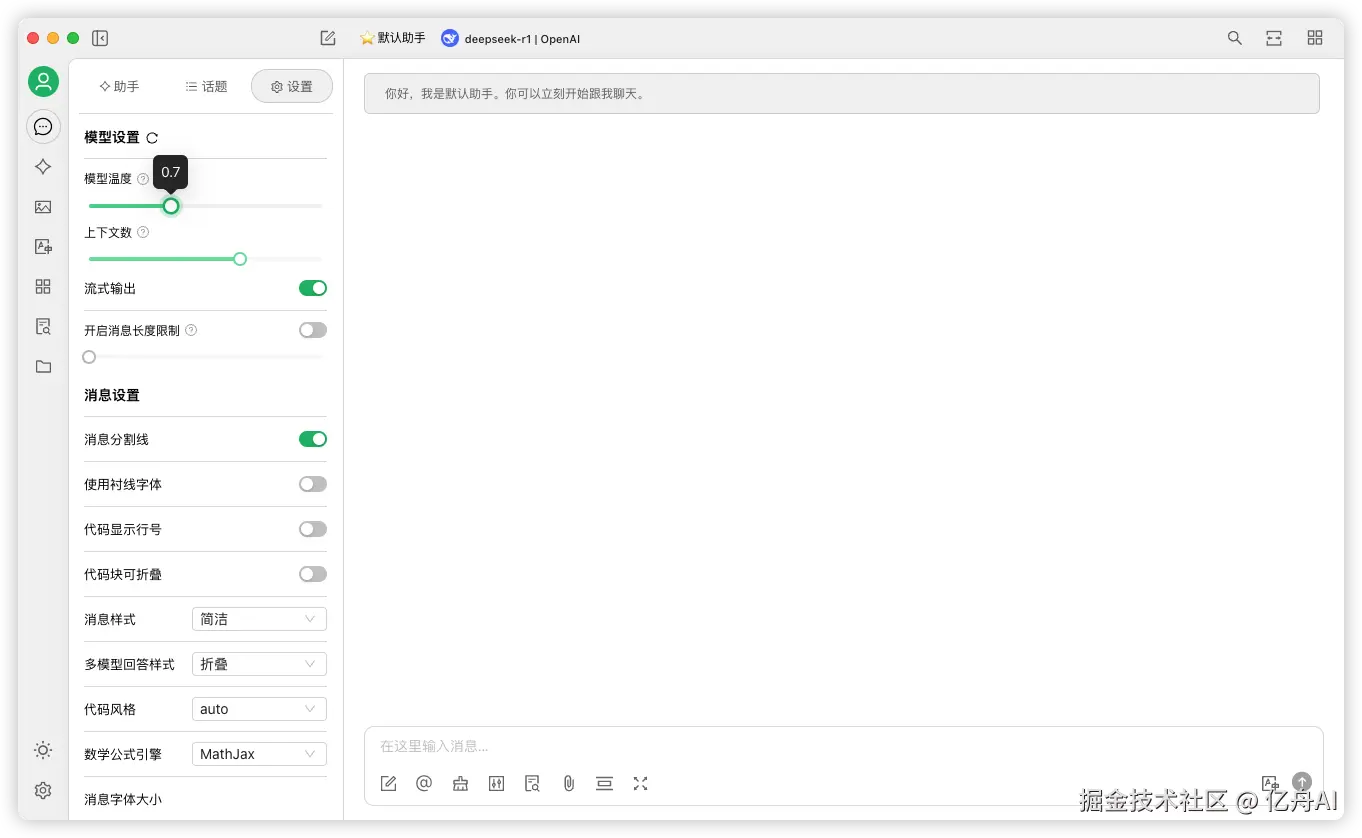 在对话前可以做一些设置,更好的使用 Deepseek。点击设置按钮,模型温度调到 0.7,上下文可以调到 10。如果对话过长还可以再加上下文长度。其他的参数不需要修改。