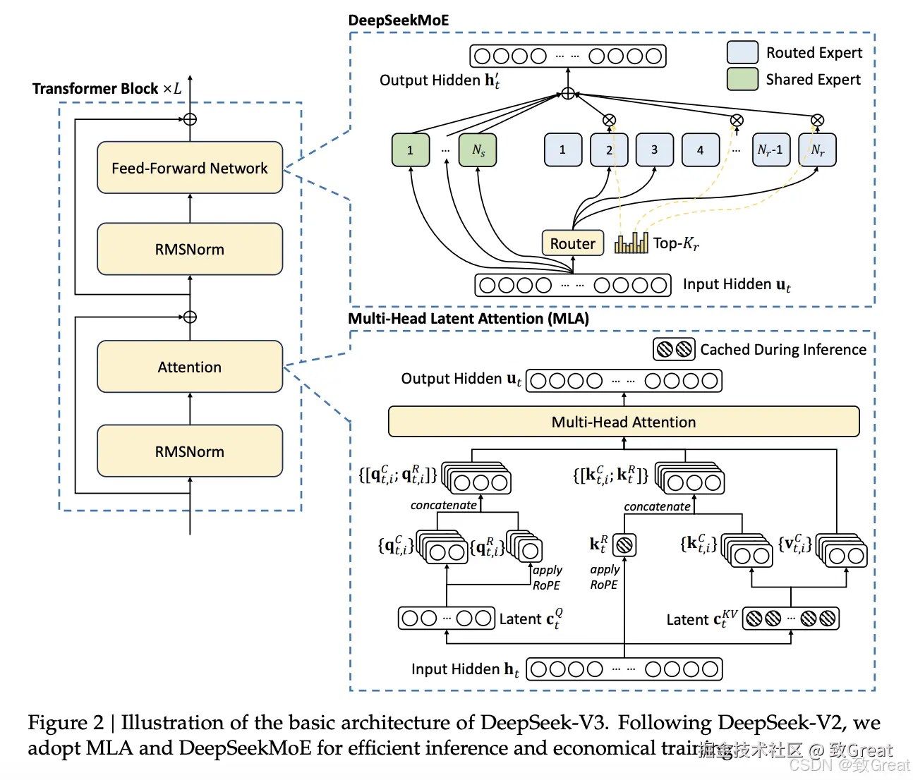 架构优化:DeepSeek-V3采用了多头潜在注意力(Multi-head Latent Attention,MLA)和DeepSeekMoE架构,这些在DeepSeek-V2中已经得到了验证,能够保持模型性能的同时实现高效的训练和推理。