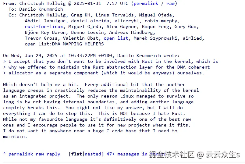 “这对我没有任何帮助。另一种语言引入的每一个额外的位都会大大降低内核作为集成项目的可维护性。Linux 能够存在这么长时间的唯一原因是它没有内部边界,而添加另一种语言完全打破了这一点。你可能不喜欢我的回答,但我会尽我所能阻止这种情况。这 不是 因为我讨厌 Rust。