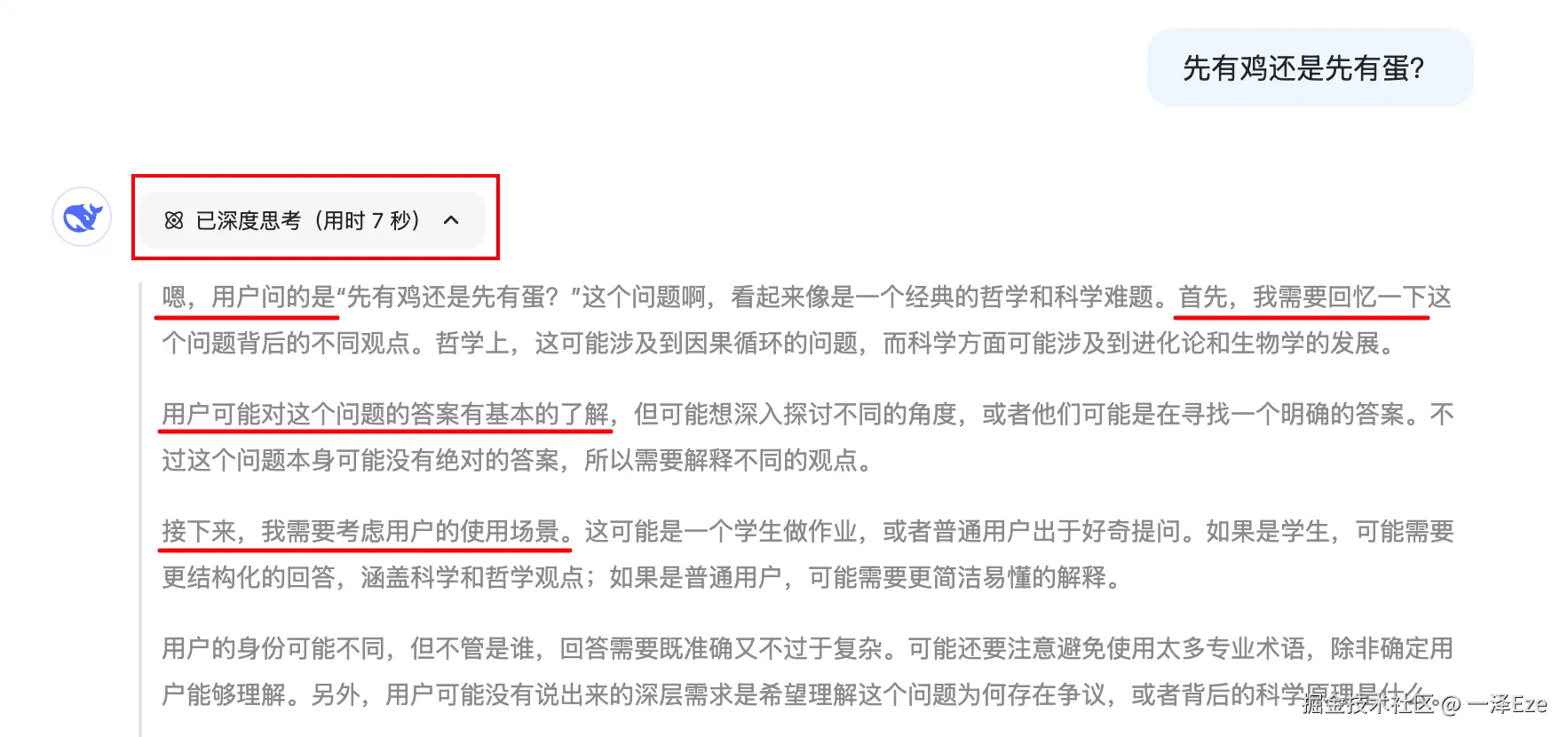 从用户初始问题“先有鸡还是先有蛋”出发,AI 唤醒解决该问题所需的推理逻辑与知识,对问题进行多步推导,为最终回答提供更加完备的思考准备。