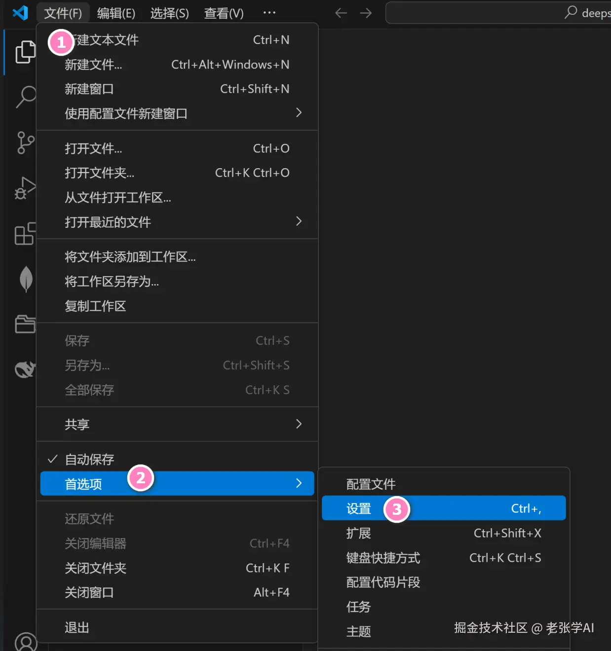 - 文件->首选项->设置->扩展->DeepSeek