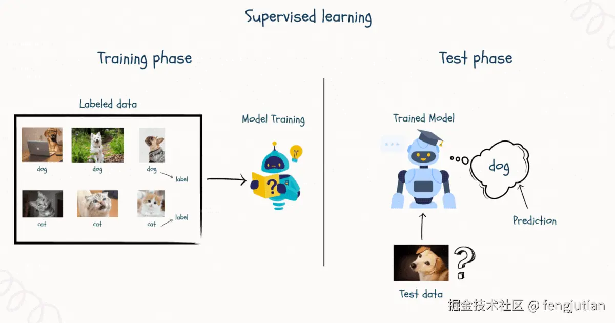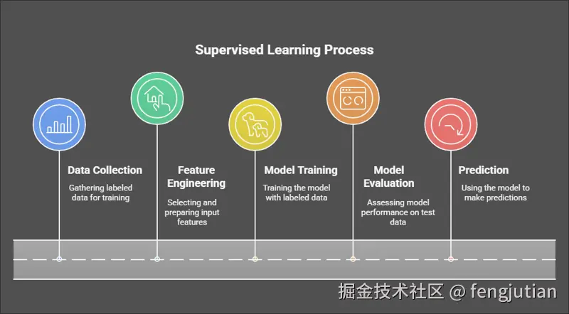监督学习是一种机器学习方法,模型通过带标签的数据进行学习。这意味着每个数据点都包括: