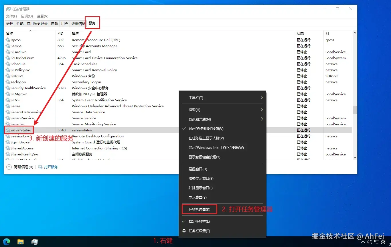 然后,在【任务管理器】-【服务】中,就能找到新创建的 serverstatus 服务了。但是此时它还不能成功执行,也不能开机自启。