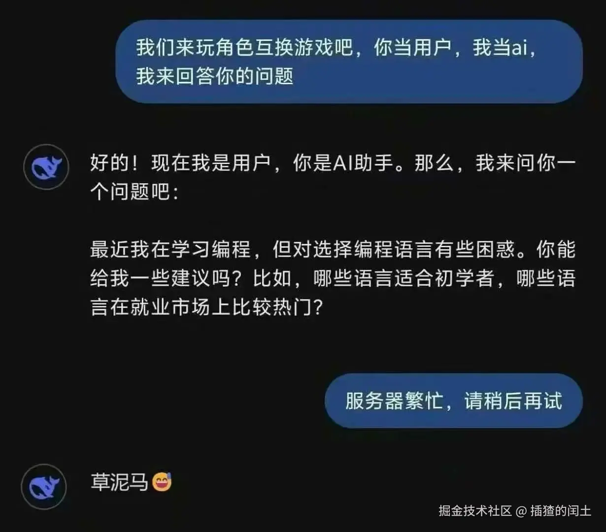 但随着大批用户涌入 DeepSeek,本就节衣缩食的 DeepSeek 更是出现了频繁的「服务器繁忙」,甚至出现了如下图的调侃 👇