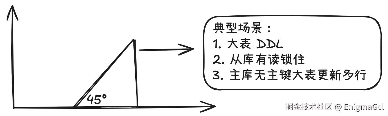 典型的大事务会导致主备同步监控呈现 45°,如下所示: