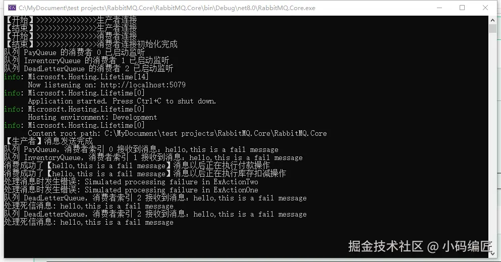八、在 WebAPI 控制器中编写测试方法,模拟实现给主交换机发送消息,当消费失败的时候,消息被发送到死信队列由死信队列消费进行后续操作。