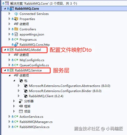 安装RabbitMQ的包(此处我没有选择最新版,因为最新版全面使用异步,关于IModel也改为了IChannel,最新版的语法有待研究),我的项目结构如下: