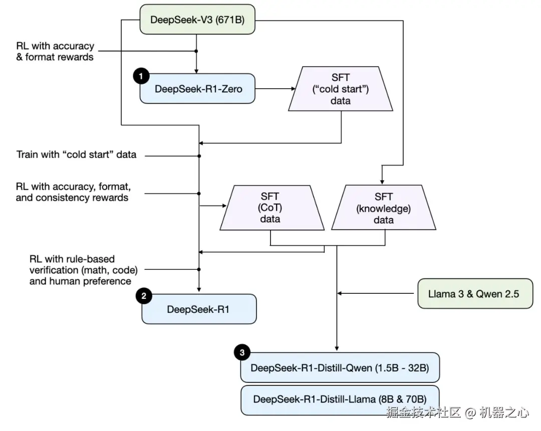 DeepSeek R1 技术报告中讨论的三种不同推理模型的开发过程。