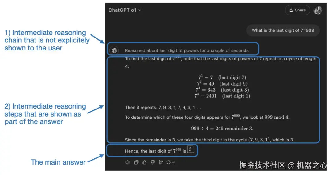 推理模型中的中间步骤可以两种方式出现。第一种,中间步骤可能显式地出现在响应中,如上图所示。第二种,一些推理 LLM(例如 OpenAI o1)则会运行多个迭代,中间步骤对用户来说是不可见的。