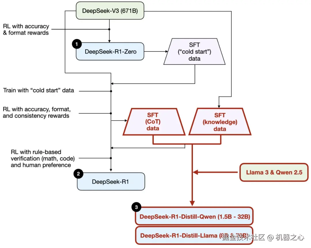 请注意,DeepSeek 并没有发布单一的 R1 推理模型,而是发布了三个不同的变体:DeepSeek-R1-Zero、DeepSeek-R1 和 DeepSeek-R1-Distill。