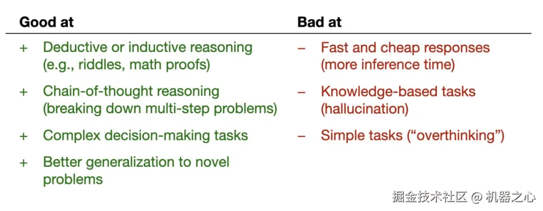 开发推理模型就是一种专业化。这能让 LLM 更擅长处理复杂任务 —— 解决这些任务时最好使用中间步骤,例子包括解答谜题、高级数学和编程难题。但是,这种专业化并不能取代其他 LLM 应用。因为将 LLM 转换为推理模型也会带来某些缺点,我将在后面讨论。
