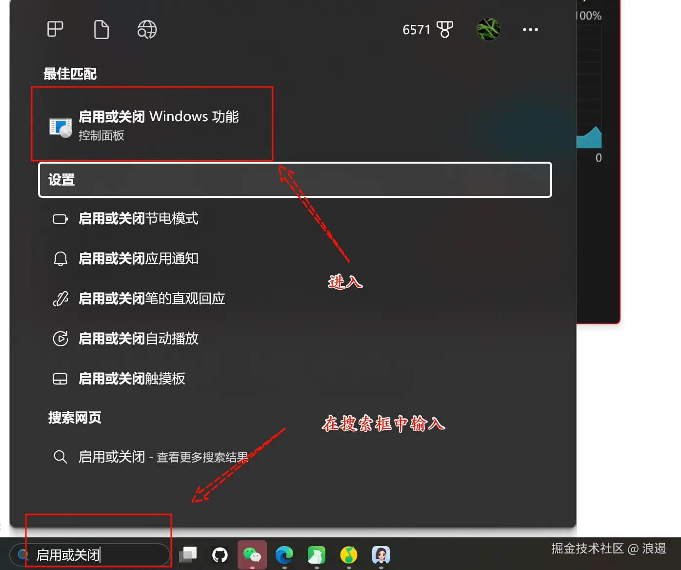 在下边栏的搜索框中 ,搜索启用或者关闭 Windows 系统