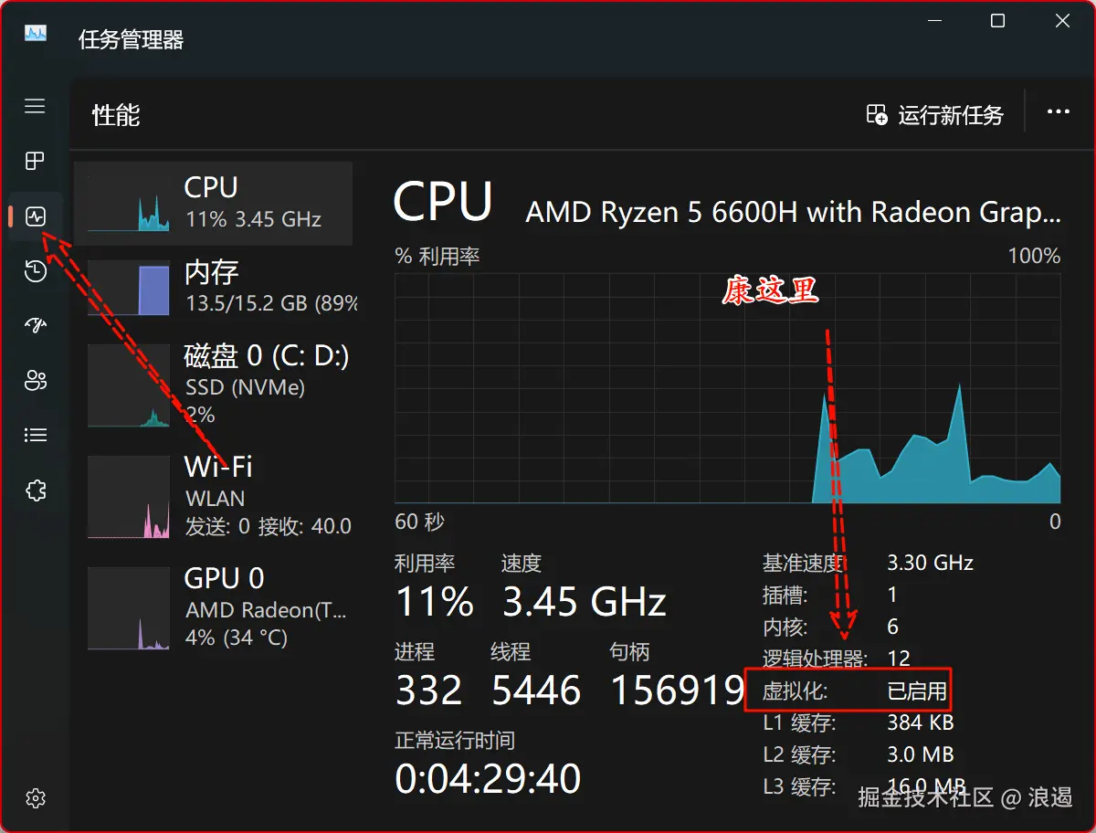 任务管理器(右键 winddows 图标) → 性能 → CPU → 查看“虚拟化”是否启用,若未启用则需在 BIOS 中启用虚拟化技术(Intel VT-x 或 AMD-V)。