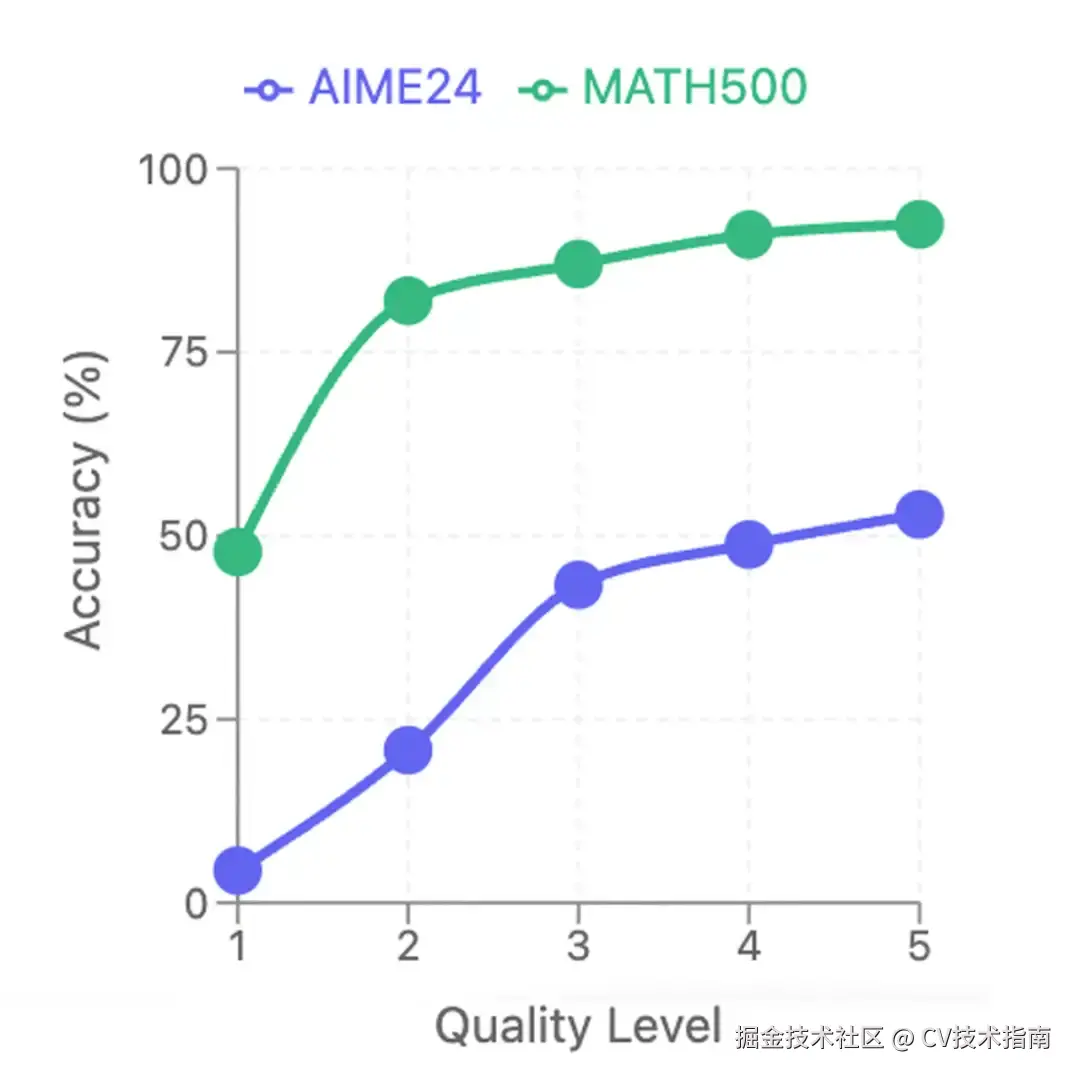 不同质量等级(1~5)推理链训练得到的模型在 AIME24 和 MATH500 上的表现
