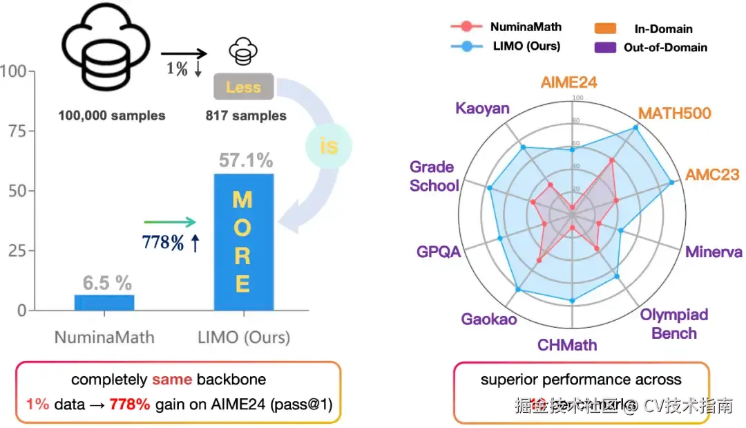 前言 在追求人工智能极限的道路上,"更大即更强" 似乎已成为共识。特别是在数学推理这一被视为 AI 终极挑战的领域,业界普遍认为需要海量数据和复杂的强化学习才能获得突破。然而,来自上海交通大学的最新研究却给出了一个令人震惊的答案:**仅需 817 条精心设计的样本,就能让模型在数学竞赛级别的题目上超越当前许多最先进模型。**这一发现不仅挑战了传统认知,更揭示了一个可能被我们忽视的事实:大模型的数学能力或许一直都在,关键在于如何唤醒它。