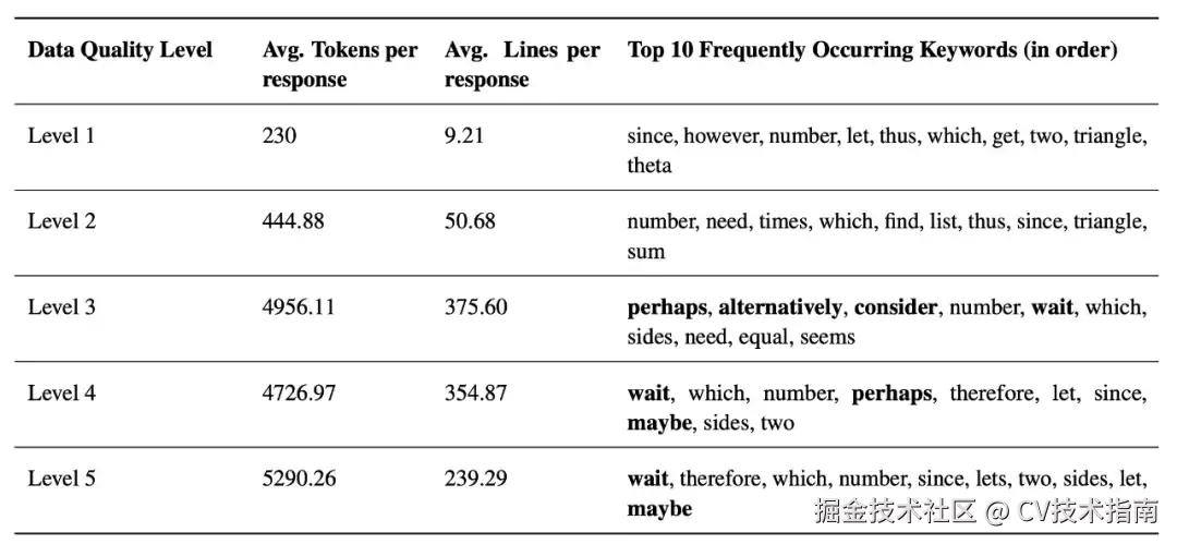 在定量分析中我们发现:随着训练样本质量的提高,模型生成的响应更长,行数更多,并且在推理过程中使用了更多的自我反思过渡词(例如,“等一下”、“也许”、“因此”)。这些高质量模型能够分配额外的计算资源,进行更深入的思考,从而在复杂的数学问题中表现出色。