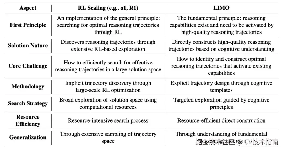 LIMO 和 RL Scaling 的对比,揭示了推理能力提升的不同路径与思路。LIMO 提供了更为根本的理解,指明了未来研究的方向:不再是无止境的数据堆砌,而是更加关注如何有效激活模型本就具备的能力。