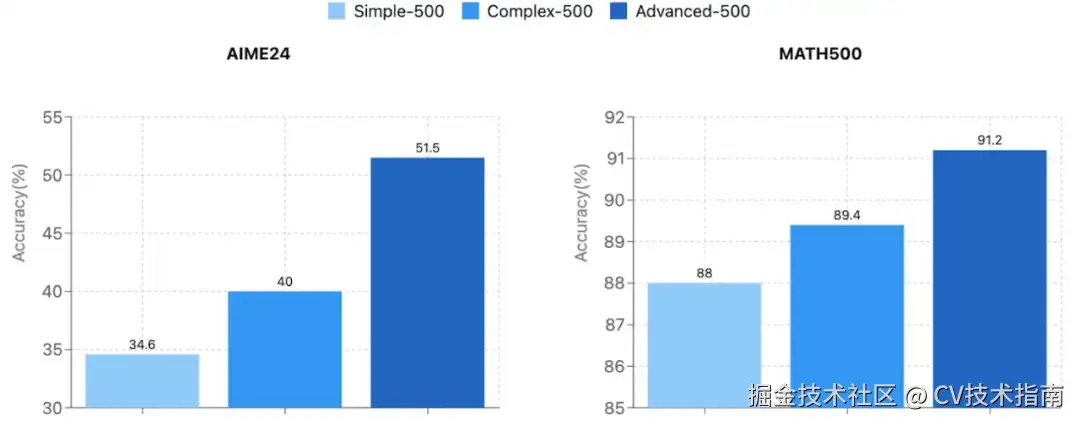 如果说推理链是解题的 “路线图”,那么问题本身则是激发模型潜力的 “催化剂”。LIMO 的研究发现,更高难度的问题能够显著提升模型的推理能力。研究人员创建了三个不同难度的问题集:Simple-500, Complex-500 和 Advanced-500,分别为他们构建高质量的推理链并训练模型。实验表明,使用 Advanced-500(竞赛级别问题)训练的模型,在基准测试中的准确率比使用 Simple-500(简单数学题)训练的模型高出 16%。