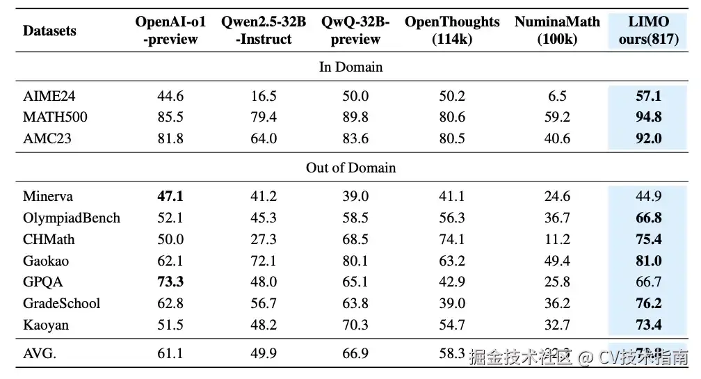 LIMO 的理论得到了实验结果的强力支持。仅凭 817 条数据,LIMO 就超越了主流的 OpenAI-o1-preview 和 QwQ 等模型。它的性能相较于自身的基座模型 (Qwen2.5-32B-Instruct) 有显著的提升,更是击败了采用数十万数据的 OpenThoughts 和 Numina Math。