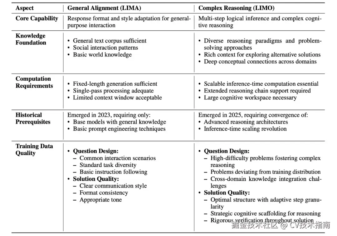 与之相对,LIMO(Less Is More for Reasoning)提出了一个不同的理论框架,认为推理能力潜藏于预训练模型中,关键在于如何通过精确的认知模板来激发这些内在能力。这一转变将研究重点从“训练新能力”转向“激活潜在能力”,强调了方向的重要性。