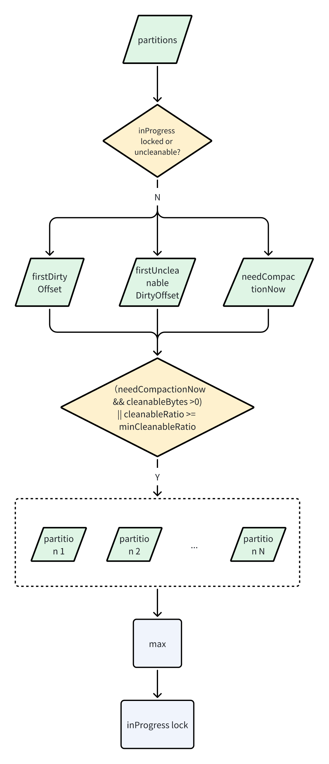 needCompactionNow:取值为 (now - min(dirty segment 的 FirstBatchTimestamp)) > maxCompactionLagMs。为 true 往往意味着这个 topic partition 太久没有被命中了;