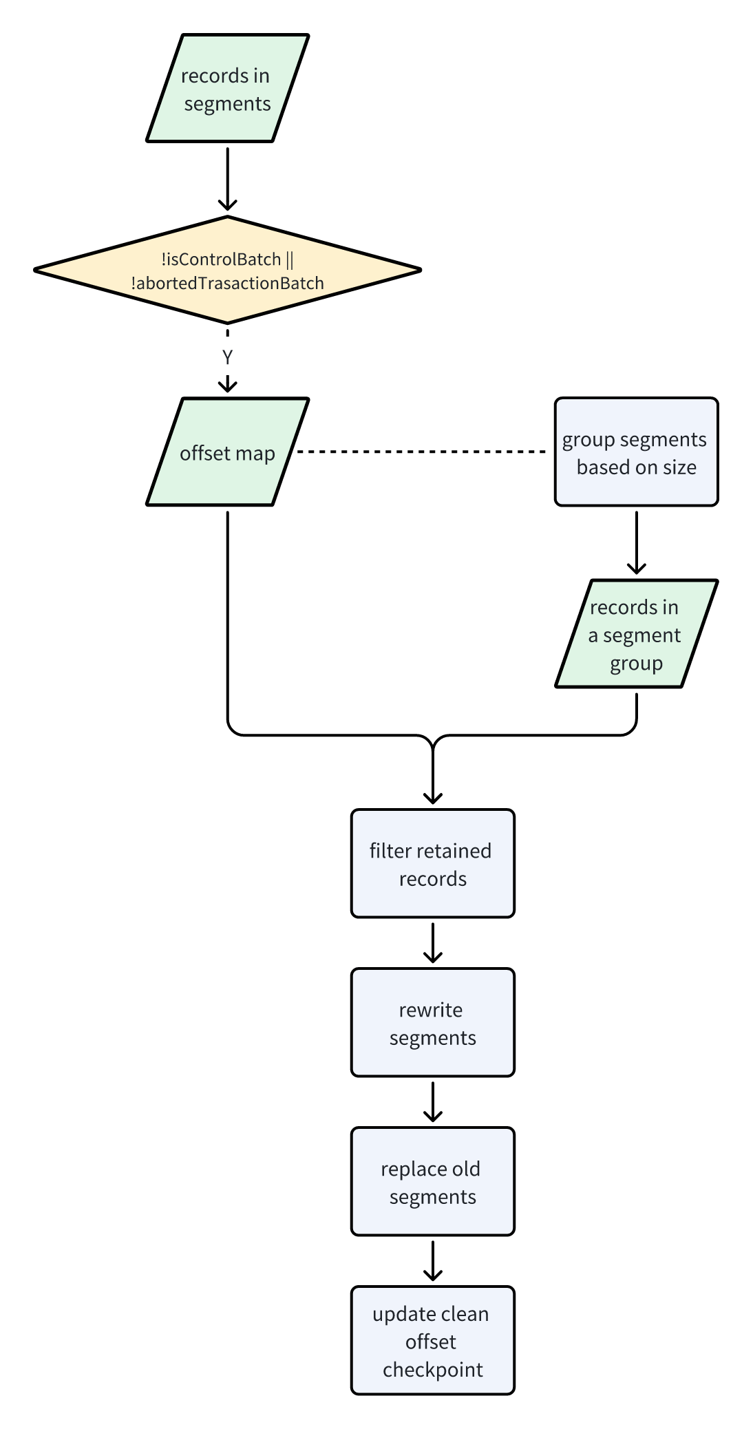之后,基于 offsetMap,为每个 group 中的 segment 中所有的 batch 进行过滤,写入到新 segment 中,不同 batch 中 record 的删除规则为: