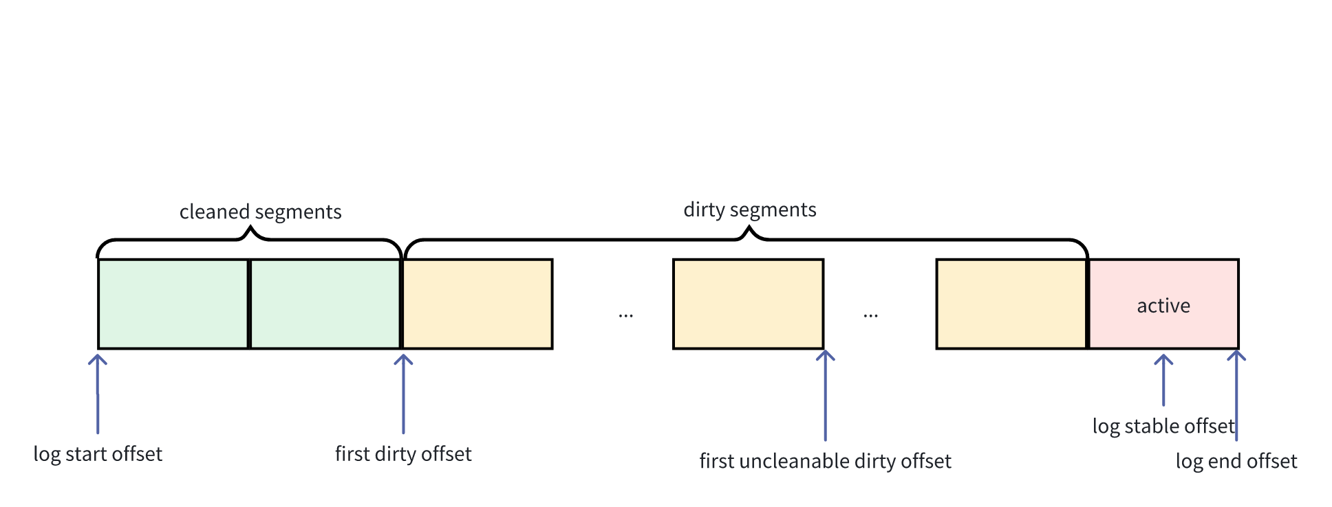 firstUncleanalbeDirtyOffset: 不可清理的起始位点,取值为 min{log.lastStableOffset, log.activeSegment.baseOffset, 不满足 minCompactionLagMs 的 segment.baseOffset};