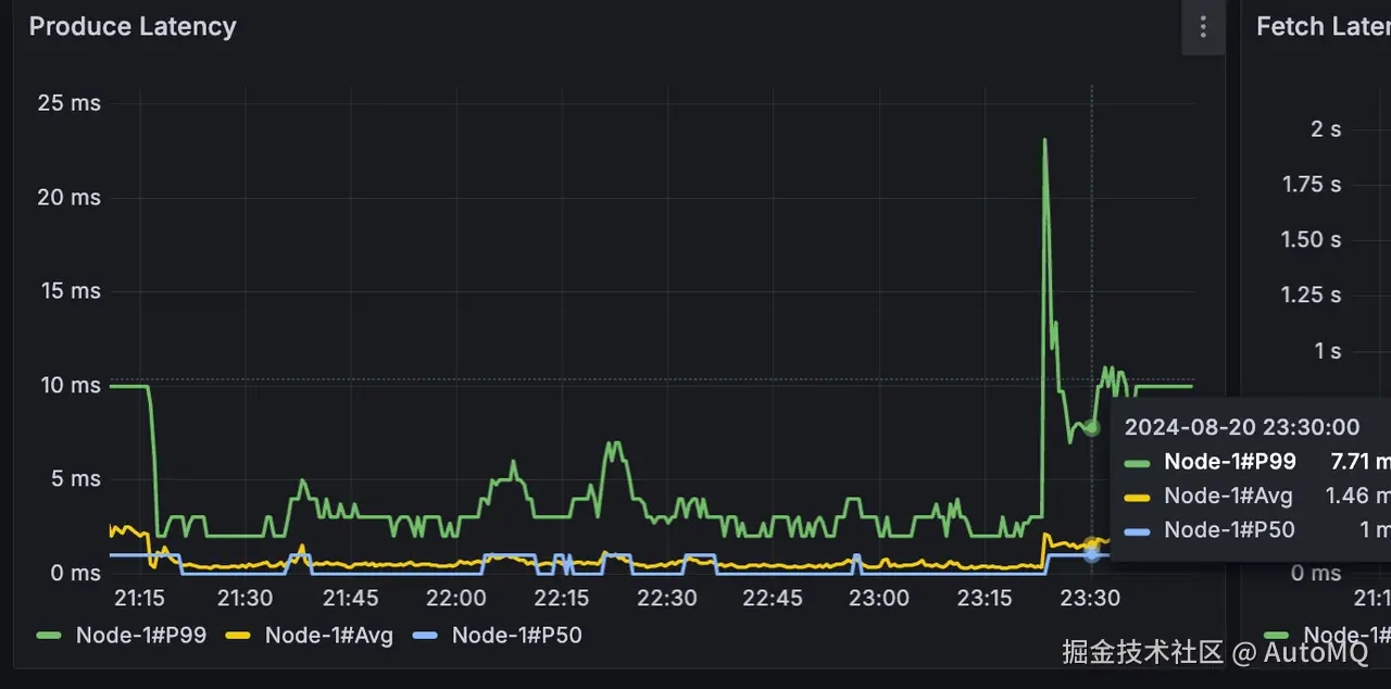 追赶读期间发送流量仍旧稳定在 200MB/s,发送耗时 P99 从 5ms 上涨到 10ms,平均耗时仍旧维持在 2ms 以下;