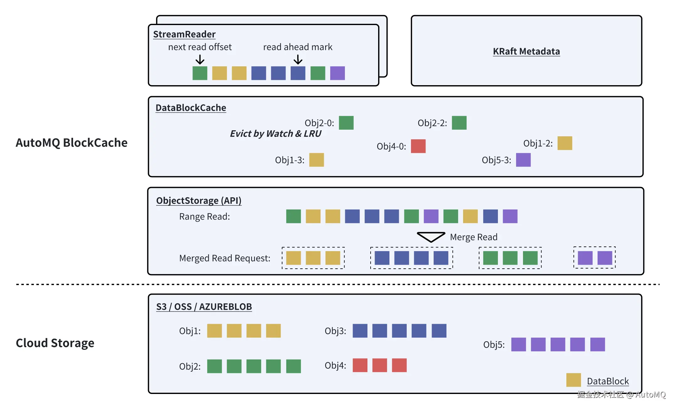 AutoMQ 从对象存储读取和缓存都是以 Data Block 为最小维度,因此追赶读的缓存称作 BlockCache。