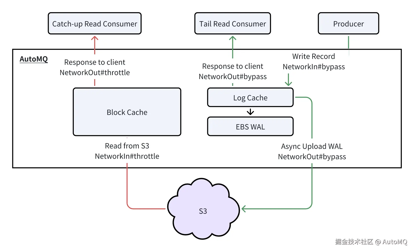 AutoMQ 在支持追尾读高并发和高吞吐的同时,通过读写隔离确保了发送流量不受影响。如下图所示,AutoMQ 的读写隔离主要由两部分保障: