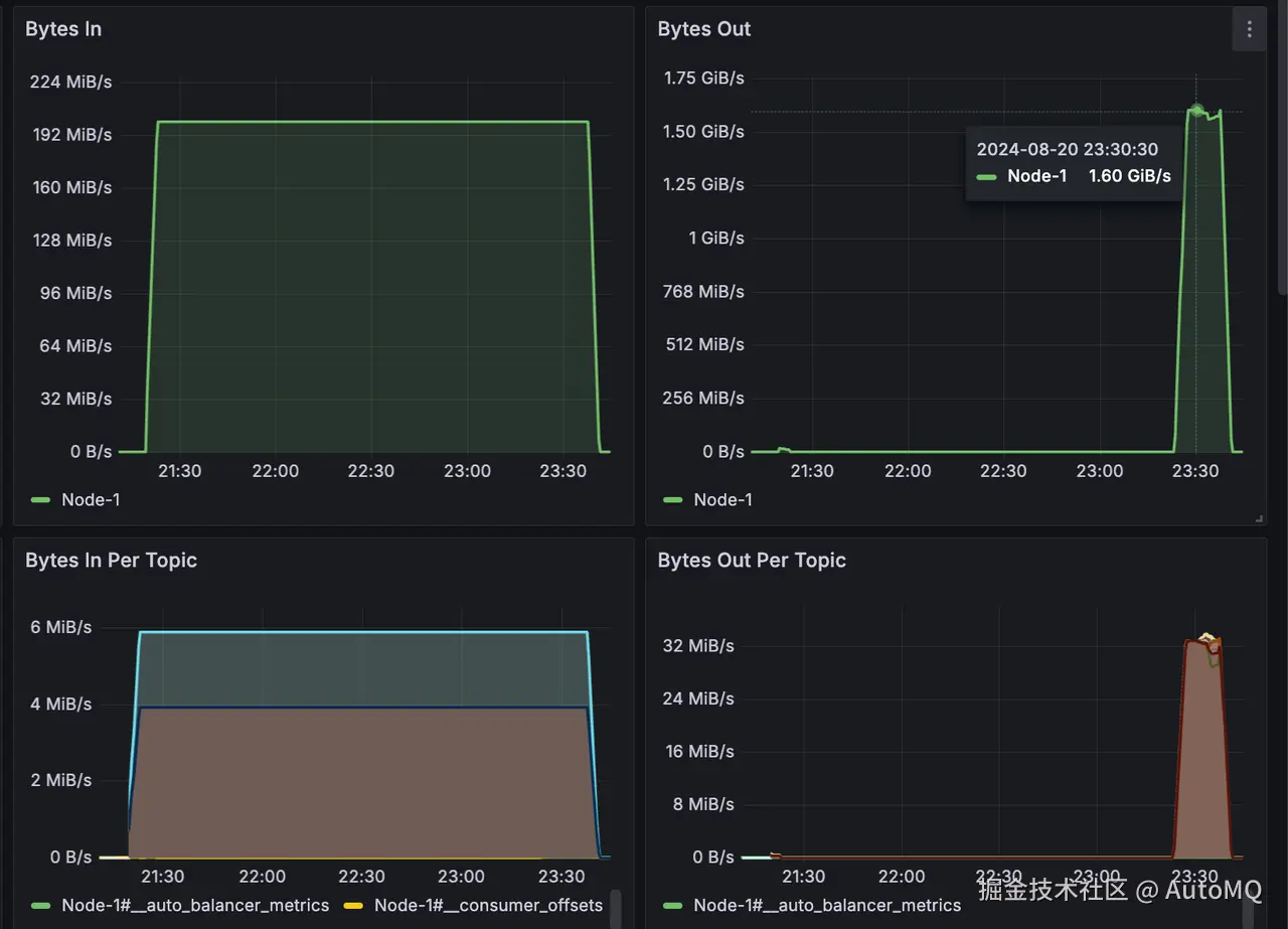 追赶读消费峰值 1.6GB/s,每个 Topic 均保持 32MB/s 的消费速度,总共耗时 18 分钟消费完 1.37 TB 的积压数据;