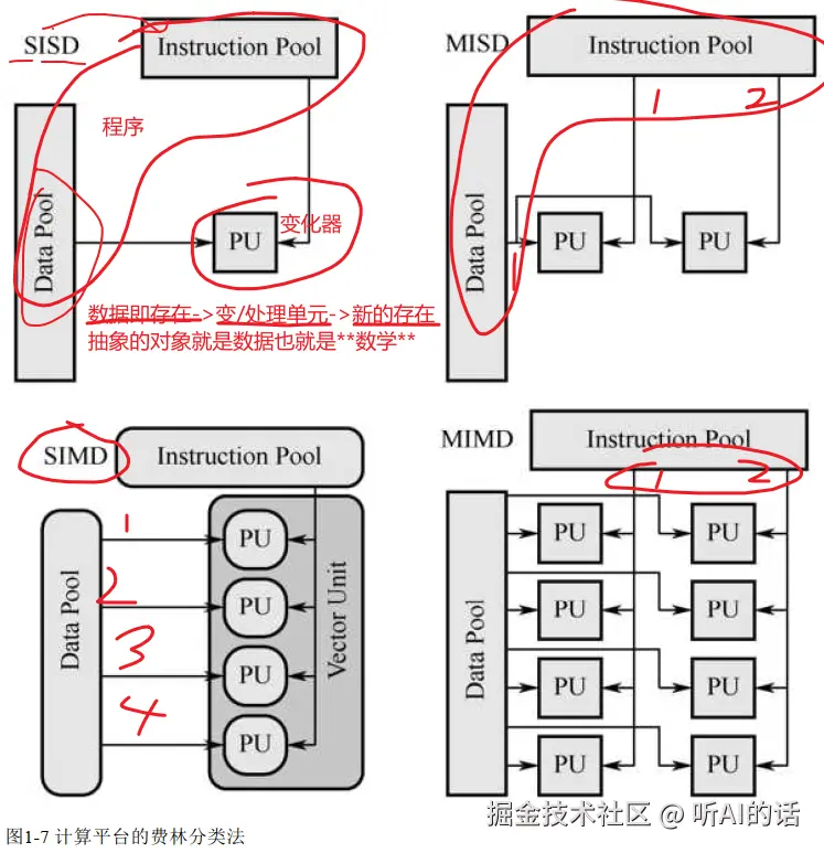- 与SIMD的纯数据并行有本质区别 什么是脉动阵列? (4)多指令多数据(MIMD)机器。MIMD机器可以同时执行多个指令流,这些指令流分别对不同的数据流进行操作。最新的多核计算平台MIMD机器的范畴,例如,Intel和AMD的双核处理器等都是MIMD机器。它是最为通用的体系结构,各个处理处理器既可以执行同一程序,也可以执行不同的程序。虽然MIMD机器的通用性最高,但是设计复杂,所以MIMD机器的性能较低。我晕了,英伟达的芯片不就是MIMD吗,为什么叫SIMT? Flynn分类法的现代演进