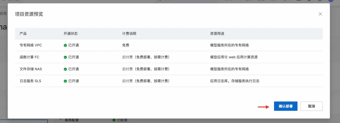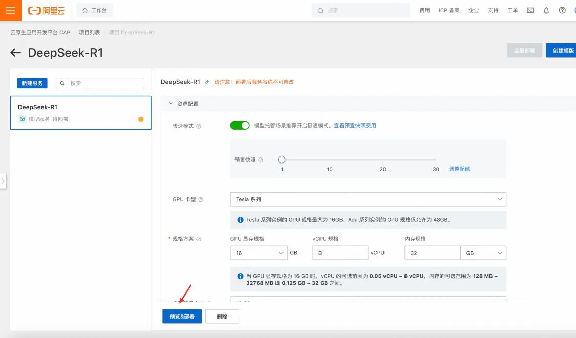 点击“预览并部署”,该阶段需下载模型,预计等待 10 分钟左右即可完成