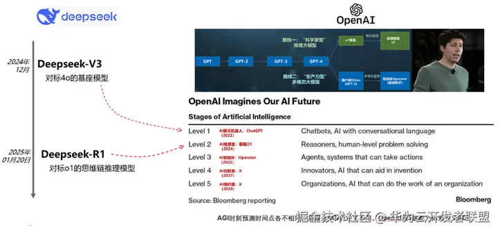 DeepSeek总共有2个主流版本,在2024年12月发布了V3版本,在2025年1月发布了R1的版本,这两个模型定位并不相同。先回顾一下历史,2024年7月份OpenAI用5级能力体系定义AGI,L1是聊天机器人,例如ChatGPT,GPT4o等L2是推理者,例如o1、o3,L3是代理型智能体,例如Operator(1月24日发布),L4是创新者,能给出人类没想到的科研与产业创新方案,L5是组织者,一组AI形成有效协同的生产力组织。