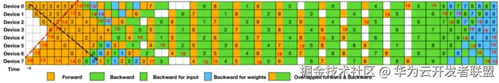 DualPipe算法以实现高效的流水线并行。与现有 PP 方法相比,DualPipe 具有更少的 PP Bubble。更重要的是,它在 Forward 和 Backward 过程中 Overlap 了计算与通信,从而解决了跨节点的高通信开销问题。