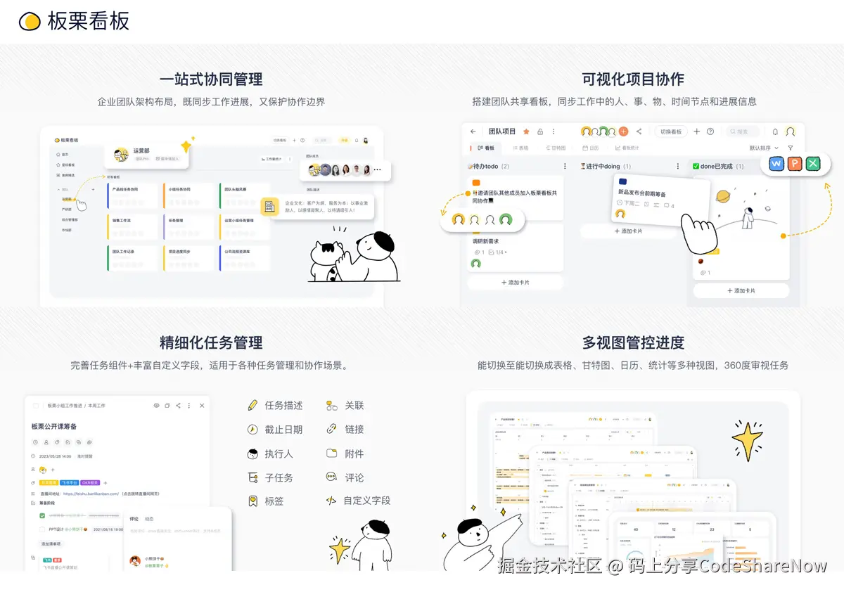 复盘中暴露的协作问题(如责任推诿、信息不对称)往往源于目标不对齐和流程不透明。板栗看板的“全员可视化协作”属性可解决以下痛点: