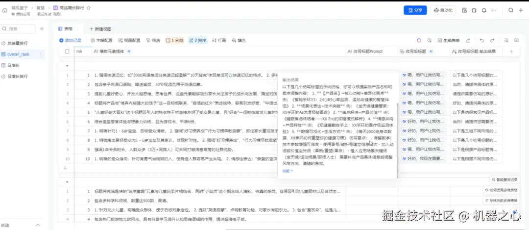 更重要的是,调用 API 处理 Excel 表格中间的过程是不可见的,我们只能用各种各样的方法增强提示词,或者加强结果的筛选来保证 AI 的结果更准确,其中没有「偷工减料」,但升级版的飞书完全透明,每一步操作都清晰可控,也进一步省去了调整格式的步骤。