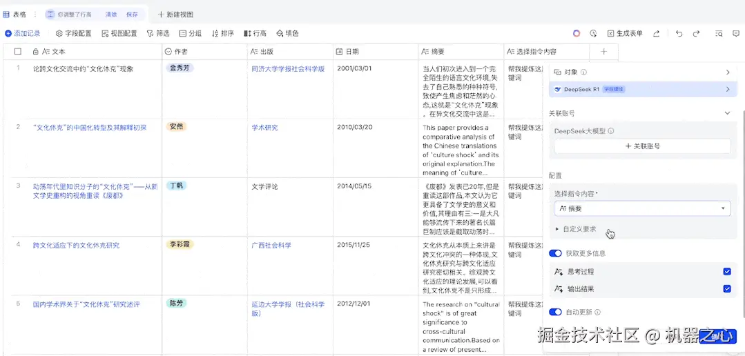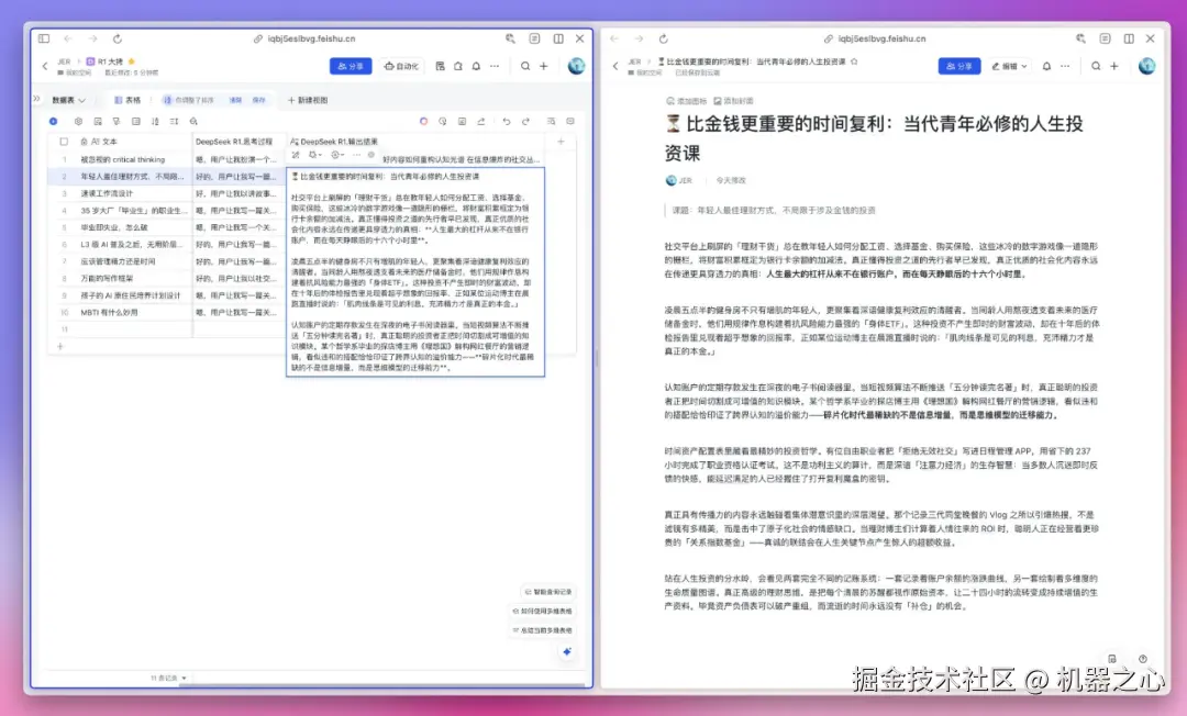 就在不久前,飞书也宣布接入了 DeepSeek-R1,这相当于在我们日常熟悉的办公软件中又探索出了一种全新的 AI 交互方式。原来我们找 AI 帮忙,往往是一次性提供一个 prompt,即使 prompt 写得再周全,从本质而言也是一对一的单点输入输出。想要一次性批量处理任务,就需要掌握一些「思维链」或者批量调用 API 服务的技巧了。