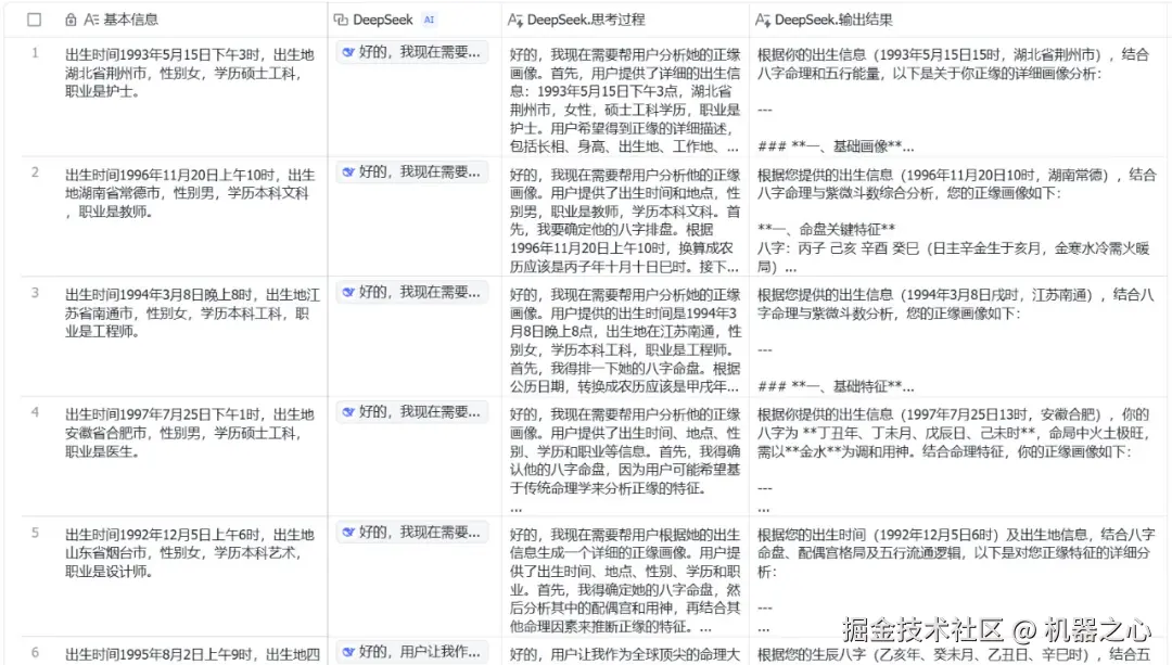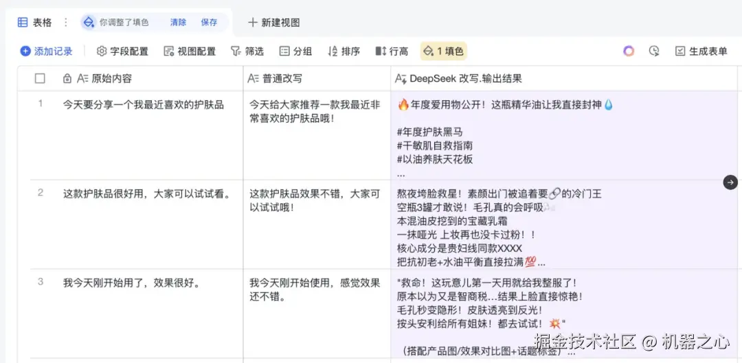 虽然这个过程并不复杂,却不如接入了 DeepSeek-R1 的飞书一步到位。现在,飞书中的每个表格都相当于一个 prompt 输入框,你可以把需求和背景当作一列数据粘贴进去,DeepSeek-R1 就能按这个队列全自动处理了。