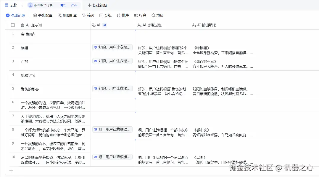 无需根据 API 模版调整、调用函数的过程,直接在多维表格中输入提示词即可