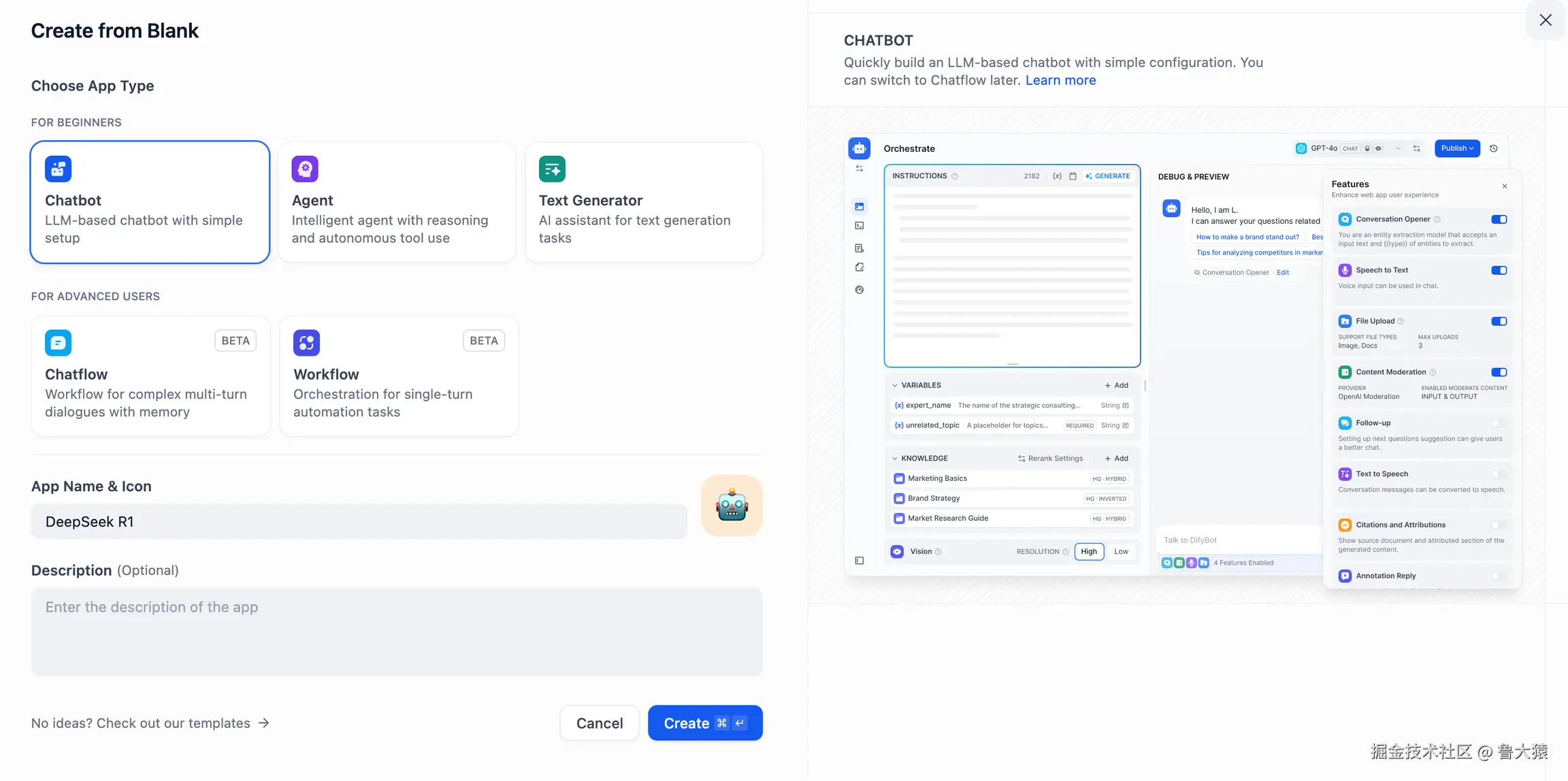 - 轻点 Dify 平台首页左侧的"创建空白应用",选择"聊天助手"类型应用并进行简单的命名。