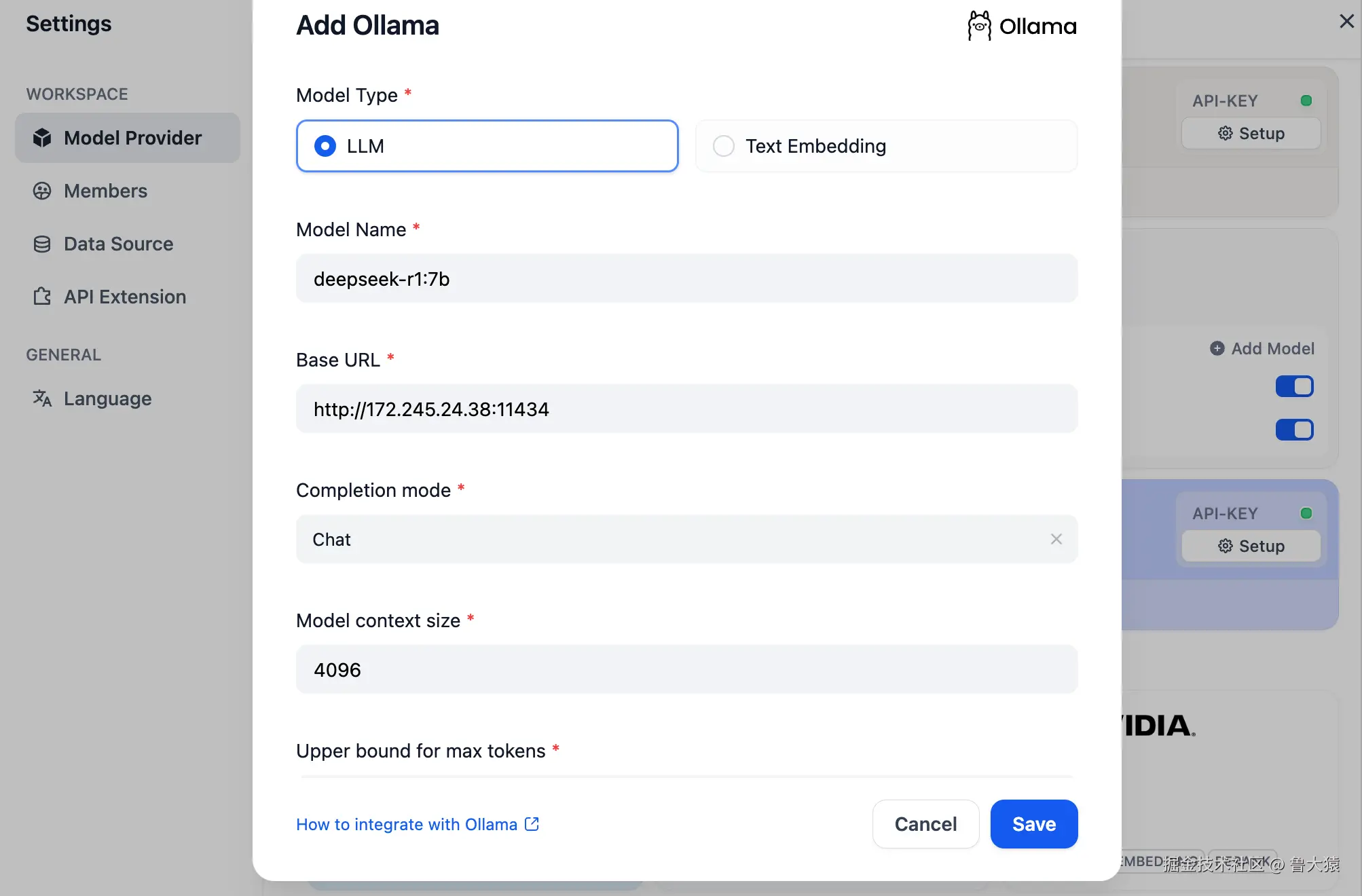 - Model Name,填写具体部署的模型型号。上文部署的模型型号为 deepseek-r1 7b,因此填写