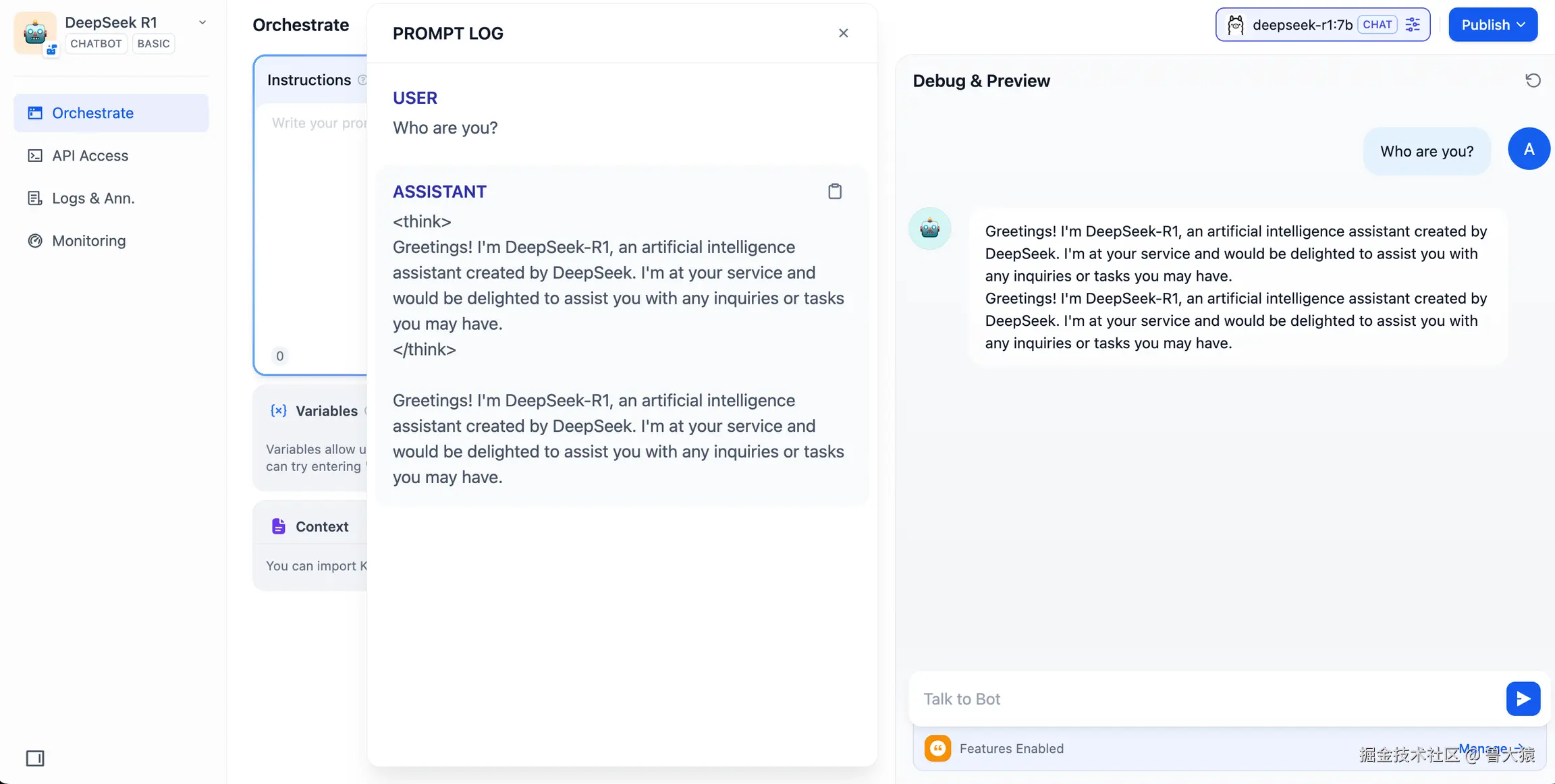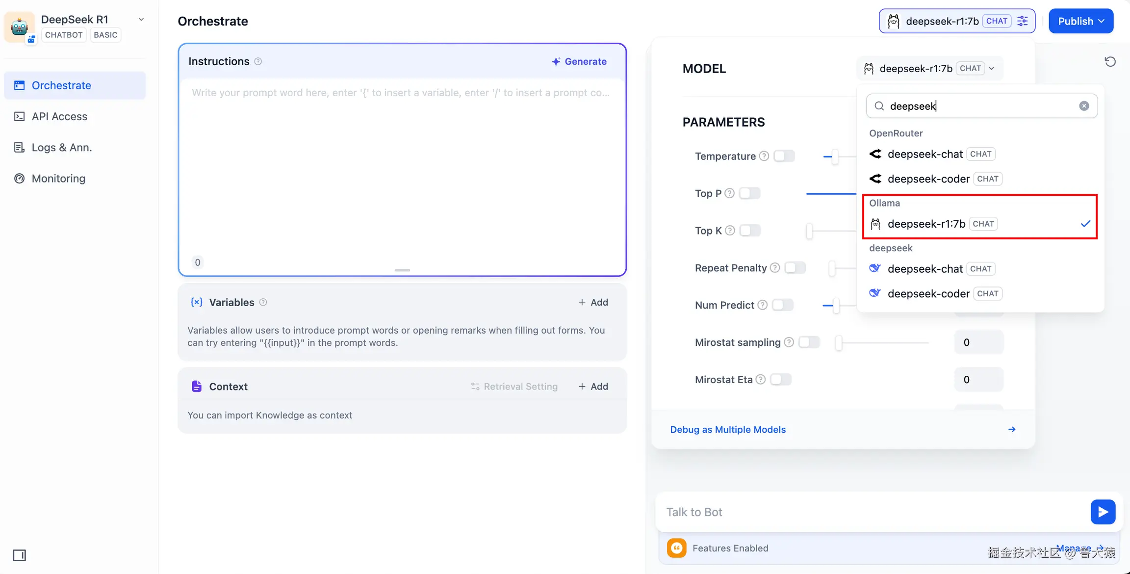 deepseek-r1:7b模型,并在系统提示词内添加{{#sys.query#}}变量以连接起始节点。如遇 API 异常,可以通过负载均衡功能或异常处理节点进行处理。